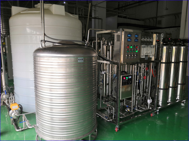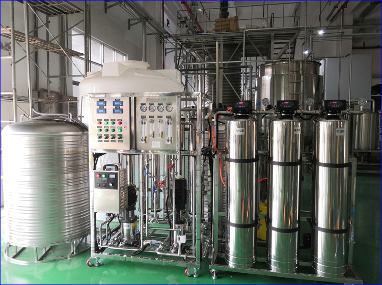 源水箱→源水增壓泵→多介質過濾器→活性碳過濾器→陽樹脂軟化器→精密過濾器→一級RO反滲透純水系統→二級RO反滲透純水系統→水氣混合器→臭氧殺菌機→不銹鋼純水罐→恒壓輸送系統→用水點
