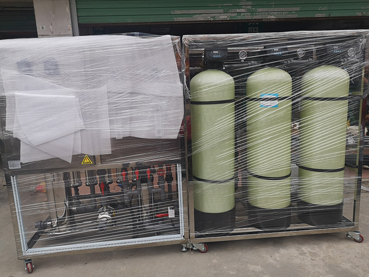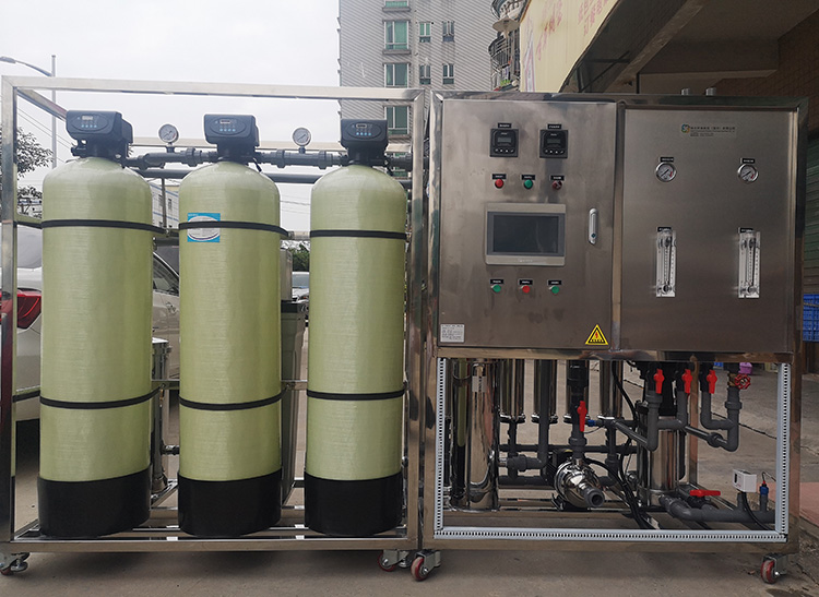 自來水---->原水箱---->供水泵---->多介質過濾器---->活性炭過濾器---->軟化過濾器---->保安過濾器---->高壓泵---->反滲透機組---->純水箱---->恒壓輸送系統---->用水點