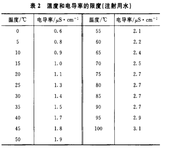 純化水可使用在線或離線電導(dǎo)率儀,記錄測定溫度。在表1中,測定溫度對應(yīng)的電導(dǎo)率值即為限度值。如測定溫度未在表1中列出:則應(yīng)采用線性內(nèi)插法計算得到限度值。如測定的電導(dǎo)率值、不大于限度值,則判為符合規(guī)定;如測定的電導(dǎo)率值大于限度值,則判為不符合規(guī)定